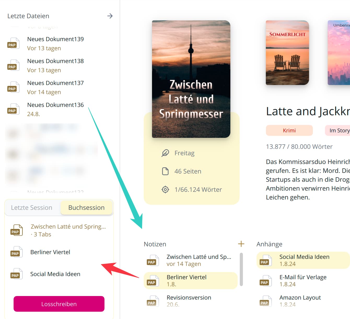Und was ich auch immer noch nicht hinbekomme, ist den Zusammenhang zwischen der Bücherdatei, wo ich eigentlich mein Cover hochgeladen und Charaktere angelegt habe und meinem Projekt. Wenn ich das aufrufe, sind nur veraltete Versionen dahinter oder gar keine Figuren. Wie bekomme ich das zusammen?