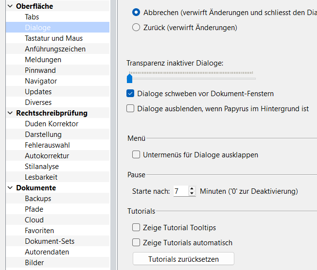 Papyrus–>EInstellungen–>Oberfläche–>DIaloge.