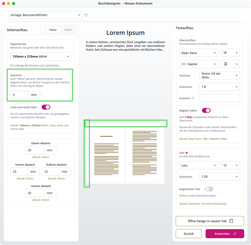 Ich habe also die Seite 13x20cm gemacht und in dem Seitenränderdialogfeld für oben, rechts, unten, links jeweils 5mm dazuaddiert.