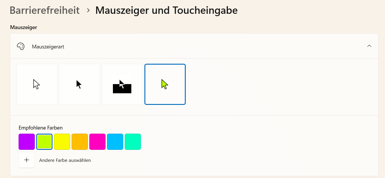 Jetzt habe ich auf einmal ebenfalls dieses Problem. In den Einstellungen habe ich aber nicht gefunden, wie man den Mauszeiger auf eine benutzerdefinierte Farbe umstellt.