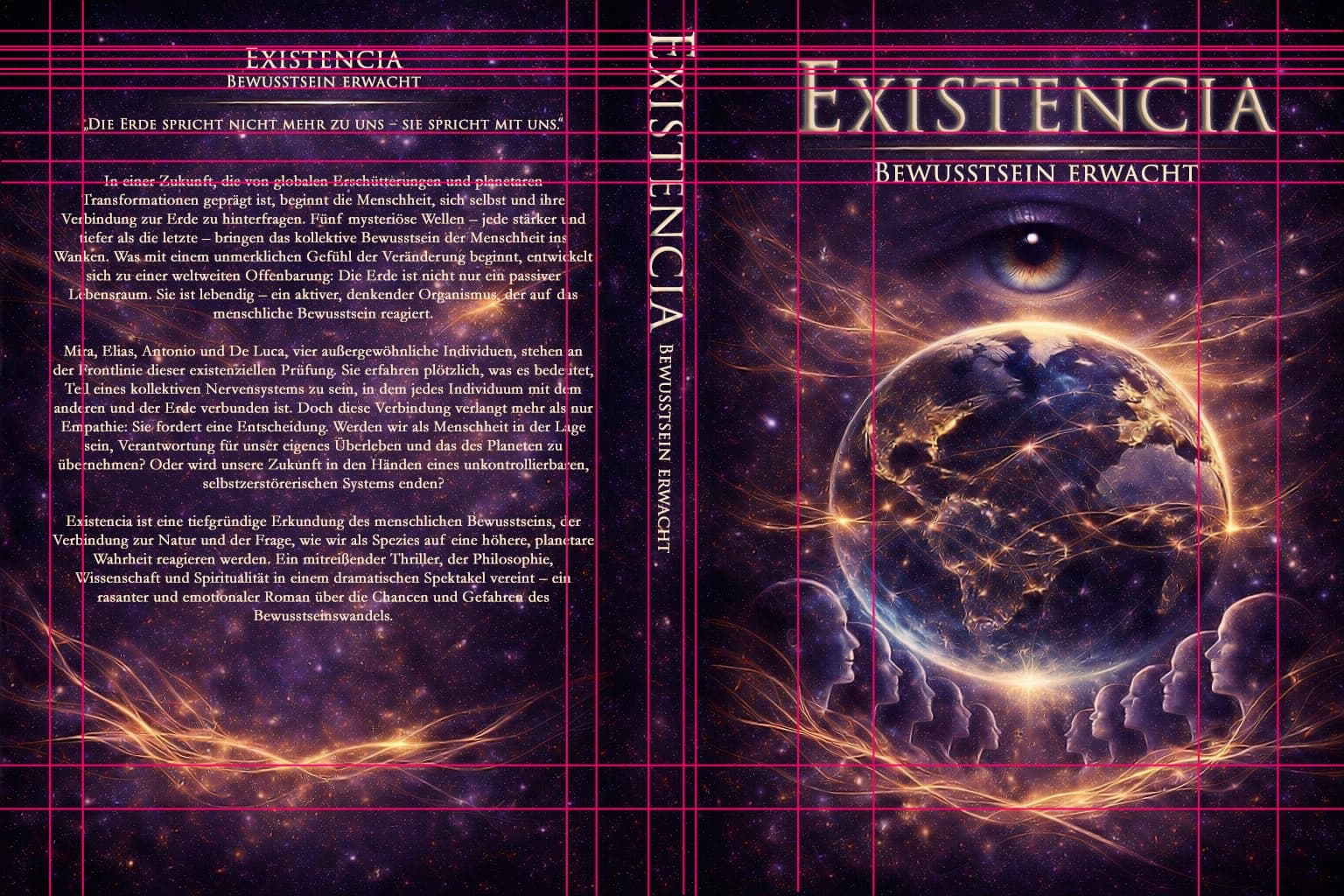 Ein sehr schönes Cover – auch die Farbharmonie finde ich stimmig. Doch der (Design-) Teufel liegt im Detail und in diesem Falle an der Unausgewogenheit von gefülltem und leerem Raum. Je weniger unterschiedliche Bezugslinien (auch wenn es Vorder- und Rückseite zusammen sind, denn ein Buch ist ein 3D-Objekt und wird in der Gesamtheit wahrgenommen), desto ruhiger und klarer wirkt die ‚Botschaft‘. Ich war mal so frech und habe das Layout mit den vorhandenen Bezugslinien (magenta) ausgestattet, und man sieht, wie viele unterschiedliche es sind. Es fehlen ja auch noch ISBN-Feld und ggf. Autorenname. Also, vielleicht solltest du noch ein wenig friemeln und so schieben, dass Linien gemeinsam genutzt werden?! Weniger ist auch hier mehr! Generell spielt sich alles zu weit oben ab.