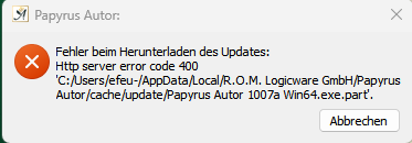 Papyrus Autor 10 versucht hier ein Update herunterzuladen, aber das klappt nicht. Ich würde die Updates abschalten: