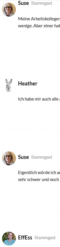EffEss ist die letzte in der Reihe und sie hat auch den letzten Beitrag geschrieben. Davor werden aber unser Gschichtldrucker und Koebes angezeigt. Die sind im Thread aber viel weiter oben. Die „echten“ letzten vier sind Suse, Heather, Suse und EffEss:
