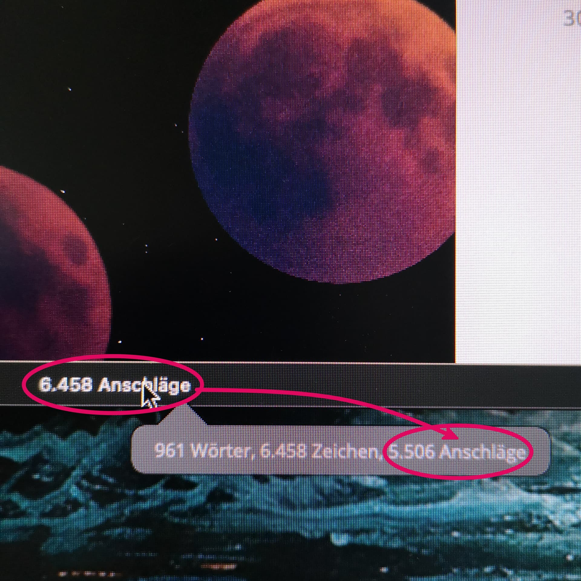 Rechts sind die Anschläge ohne Leerzeichen, also das, was als „Anschläge“ bezeichnet wird. In meinem Fall 7.951.