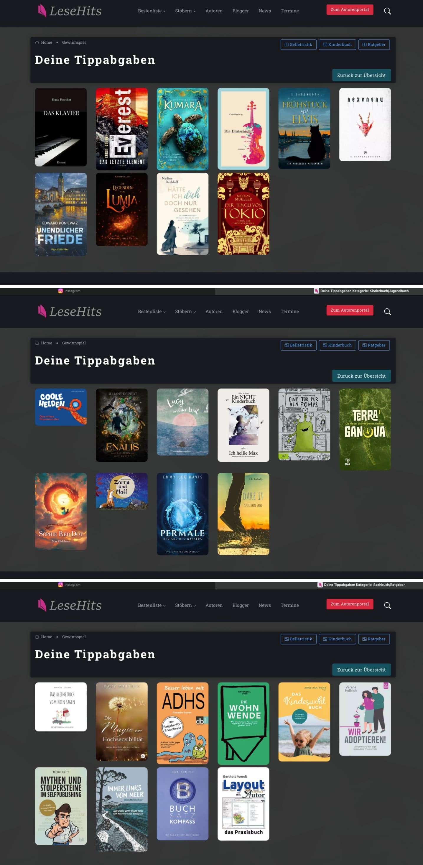 … soeben bei Lesehits meinen Longlist-‚Lottoschein‘ für alle drei Kategorien abgegeben. Belletristik war schwer, weil hier 10 Titel viel zu wenig für die riesige Auswahl sind. Kinder- und Jugendbücher waren deutlich weniger, aber dafür noch weniger ‚attraktive‘ Titel, um überhaupt auf 10 zu kommen und Sachbücher fand ich am schwierigsten zu bewerten, denn ‚Knaller-Cover‘ waren kaum auszumachen und ich gestehe, dass ich auch nach vermuteten Inhalten bewerten musste. Aber hinter den gewählten Titeln kann sich alles natürlich mögliche verbergen. Ich hoffe, die echten, finalen Longlists schauen tiefer!!