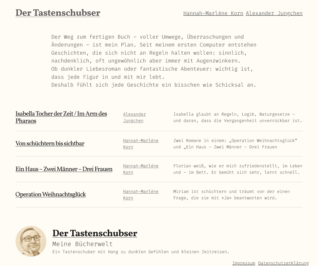 Die Domain wird tastenschubser.de werden - ihr braucht noch nicht hingehen, da ist zur Zeit ein Passwortschutz, das Design ist noch sehr Beta und die rechtliche Ecke ist unfertig. Das Impressum steht, die Datenschutzerklärung ist lückenhaft. Dabei habe ich kaum was: Keine Cookies, keine sozialen Medien, keine Analytik, keine externen Fonts… nur der Hoster zeichnet die üblichen Statistikdaten auf und ich verlinke auf meine Bücher bei BoD.