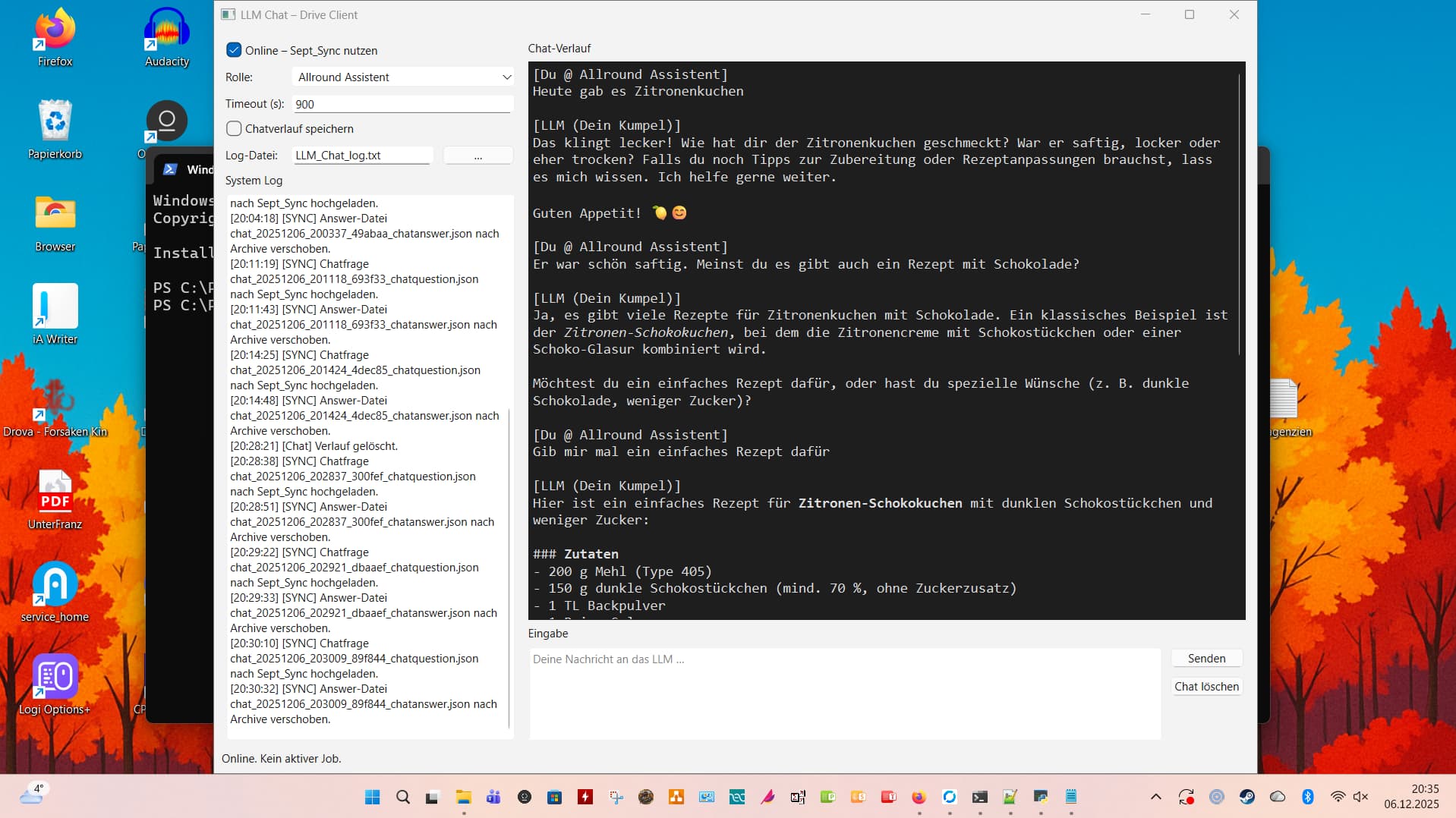 Ich habe eine experimentelle Client Software geschrieben, um von jedem beliebigen Ort mit „meiner“ KI zu schreiben. Funktionieren tut das über Google Drive. (Cloud-Speicher). Mein Chat Programm nutzt den Ort als Briefkasten und legt dort Anfragen ab., die mein Ki Computer dort findet und bearbeitet.
