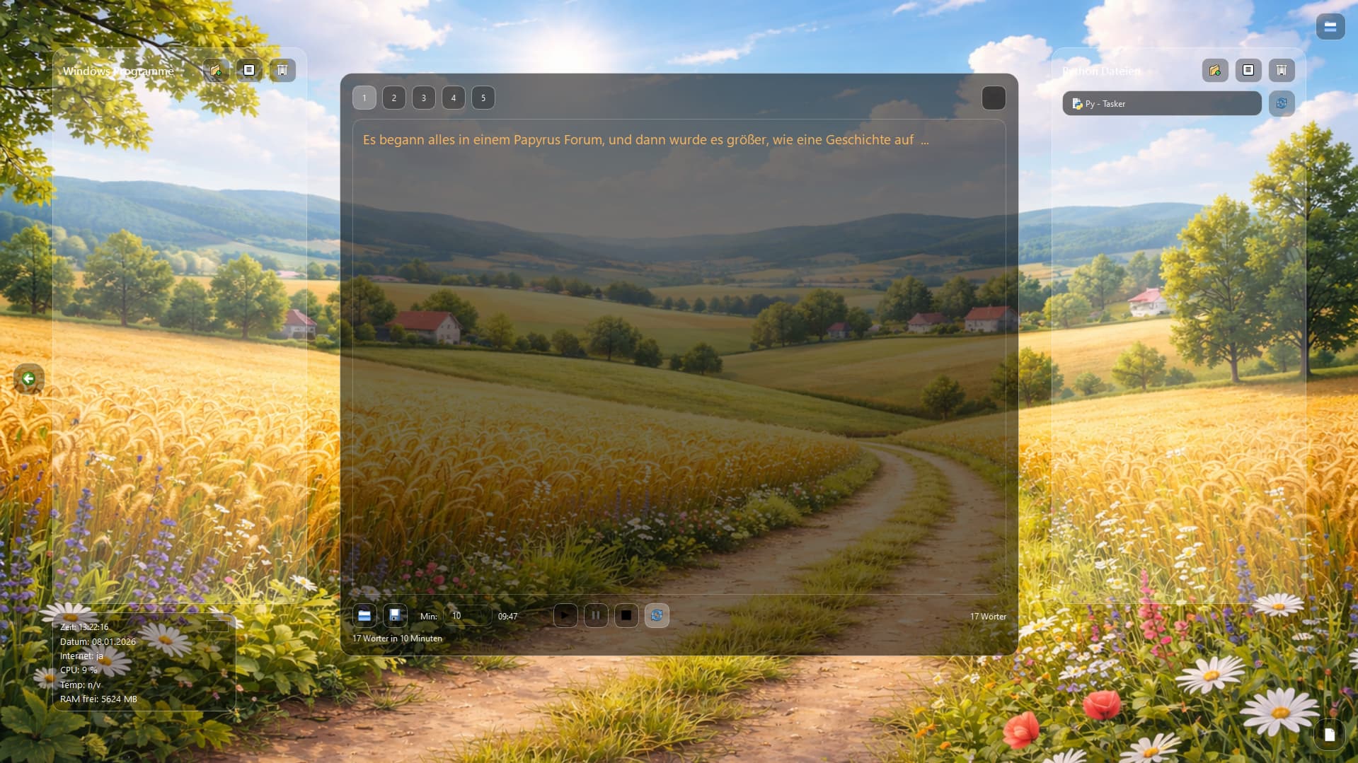 Besonderes … wenn man zur Prokrastination neigt, habe ich ein kleines Schreibprogramm direkt transparent als glasfläche in den desktop integriert. Jederzeit ein Kapitel schreiben, nur unten rechts das icon klicken.