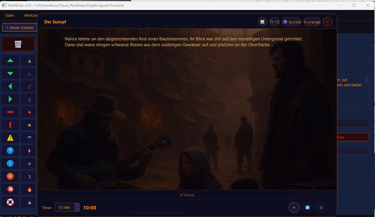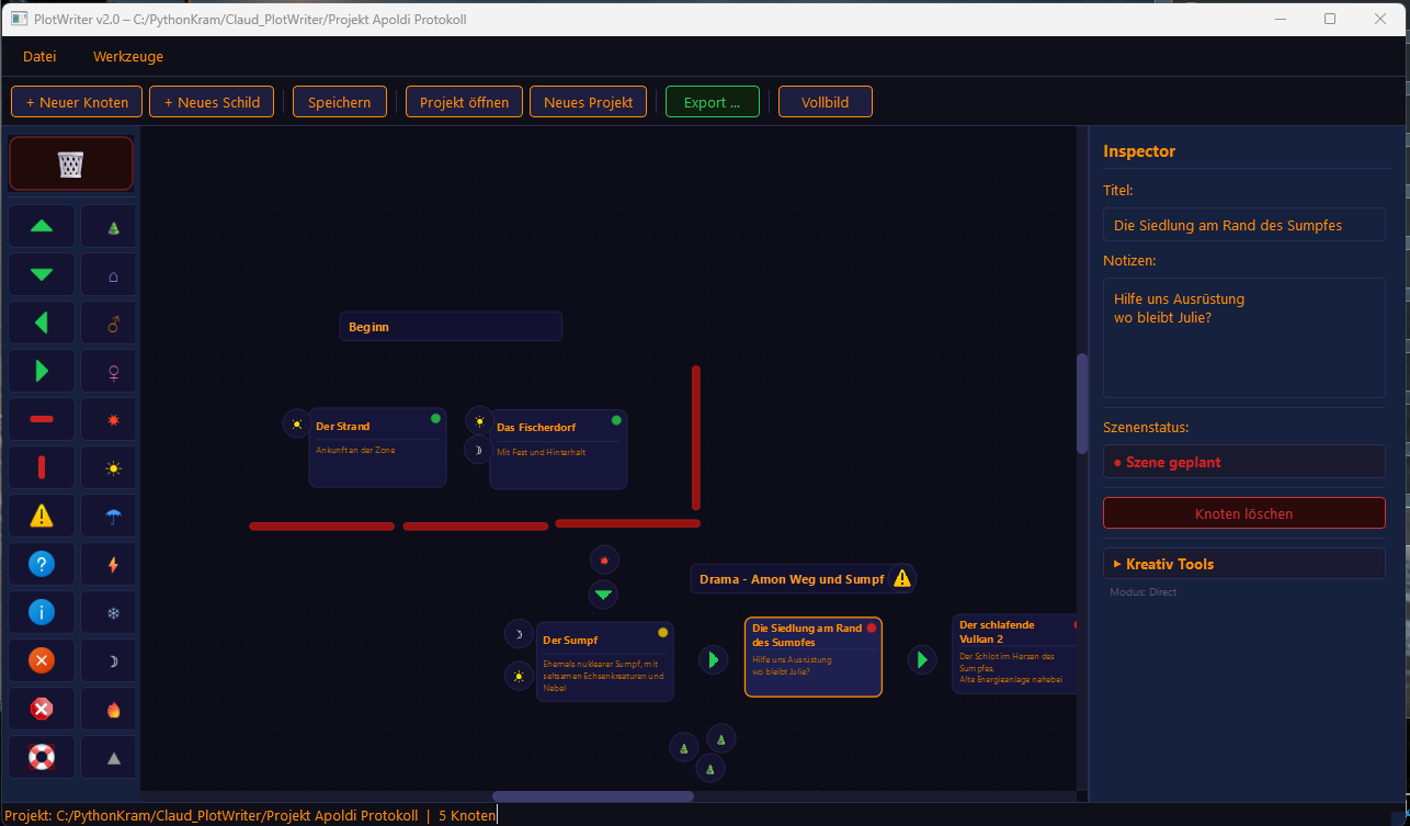 Wieder mit eigener Software experimentiert. Hier der Prototyp eines „Plotters“ der mit Drag und Drop von „Grafik icons“ und „Rahmen ziehen und bewegen“ funktioniert. So kann man sich seine Handlung wie auf einem Spielplatz zurechtlegen.