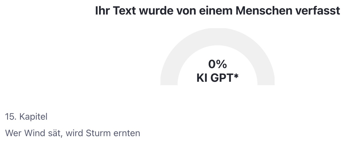 Ich danke dir von Herzen…Ich habe mich gerade schon selbst gefragt, ob ich mich selbst belüge und heimlich meine Texte mit KI schreibe und dann mir selbst gegenüber so tue, als wäre ich ein Autor. Puhhh, ich bin froh…Auch wenn es nur ein KI-Detektor war. ![]()