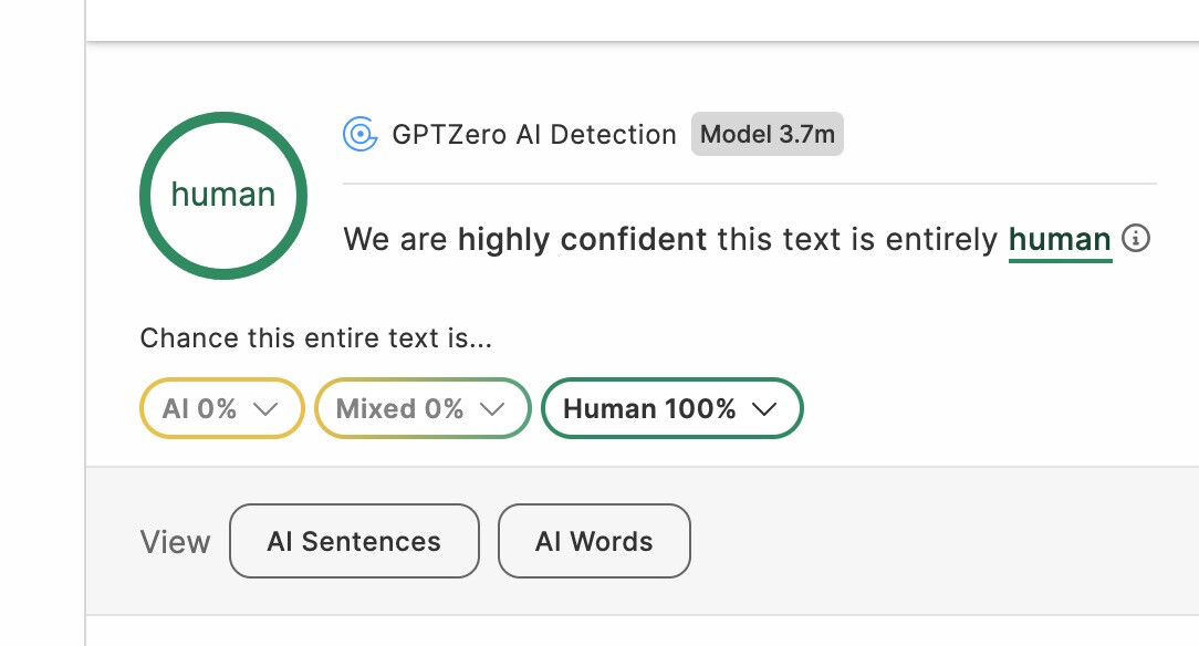 Interessant, bei GPTZero liege ich auch zu 100% human, genauso allerdings auch ein Text, der von einer KI stammt.