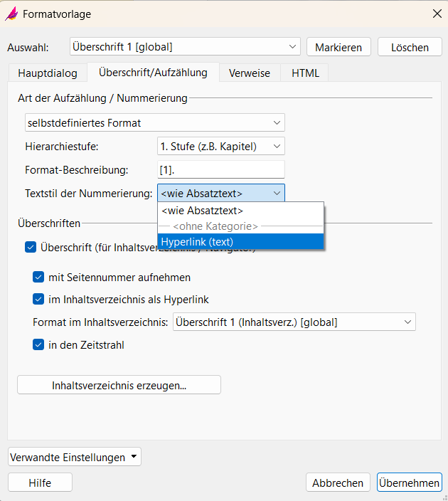 Ich verstehe nicht, was ich falsch mache: Seit ich auf die neueste Papyrus-Version umgestiegen bin, macht Papyrus aus meinen „Überschrift 1“-Überschriften immer wieder Hyperlinks, also färbt sie blau. Wenn ich mit Rechtsklick draufgehe, sehe ich nur die Sprungmarke und die Option „Sprungmarke löschen“. Sobald ich die Sprungmarke gelöscht habe, bekomme ich die Option „Link ändern“ und „Link löschen“ angezeigt. Klicke ich auf „Link ändern“, ist da aber kein Link hinterlegt. Lösche ich ihn, wird er gelöscht, aber sobald ich das Dokument speichere, schließe und erneut öffne, ist der blaue Link ins Nirgendwo wieder da. Mich nervt das total, weil Papyrus dann beim Export jedes Mal meckert, dass es fehlerhafte Links gibt. Dann muss ich die wieder von JEDEM Kapitel einzeln löschen, bevor ich die EPUB exportieren kann. Das kann doch nicht Sinn der Sache sein? Also … wie bekomme ich diese Links ein für allemal weg???