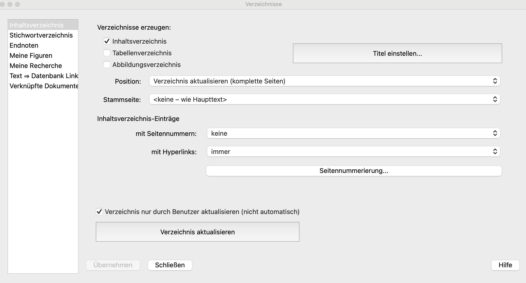 Aktuell versuche ich das Inhaltsverzeichnis fürs e-Book zu erstellen. Leider bekomme ich die Seitenzahl im IHV nicht weg. Wenn ich hier (Screenshot) auswähle, dass keine Seitennummern angezeigt werden sollen und ich anschließend auf aktualisieren klicke, verschwindet das gesamte IHV. Irgendwelche Tipps?