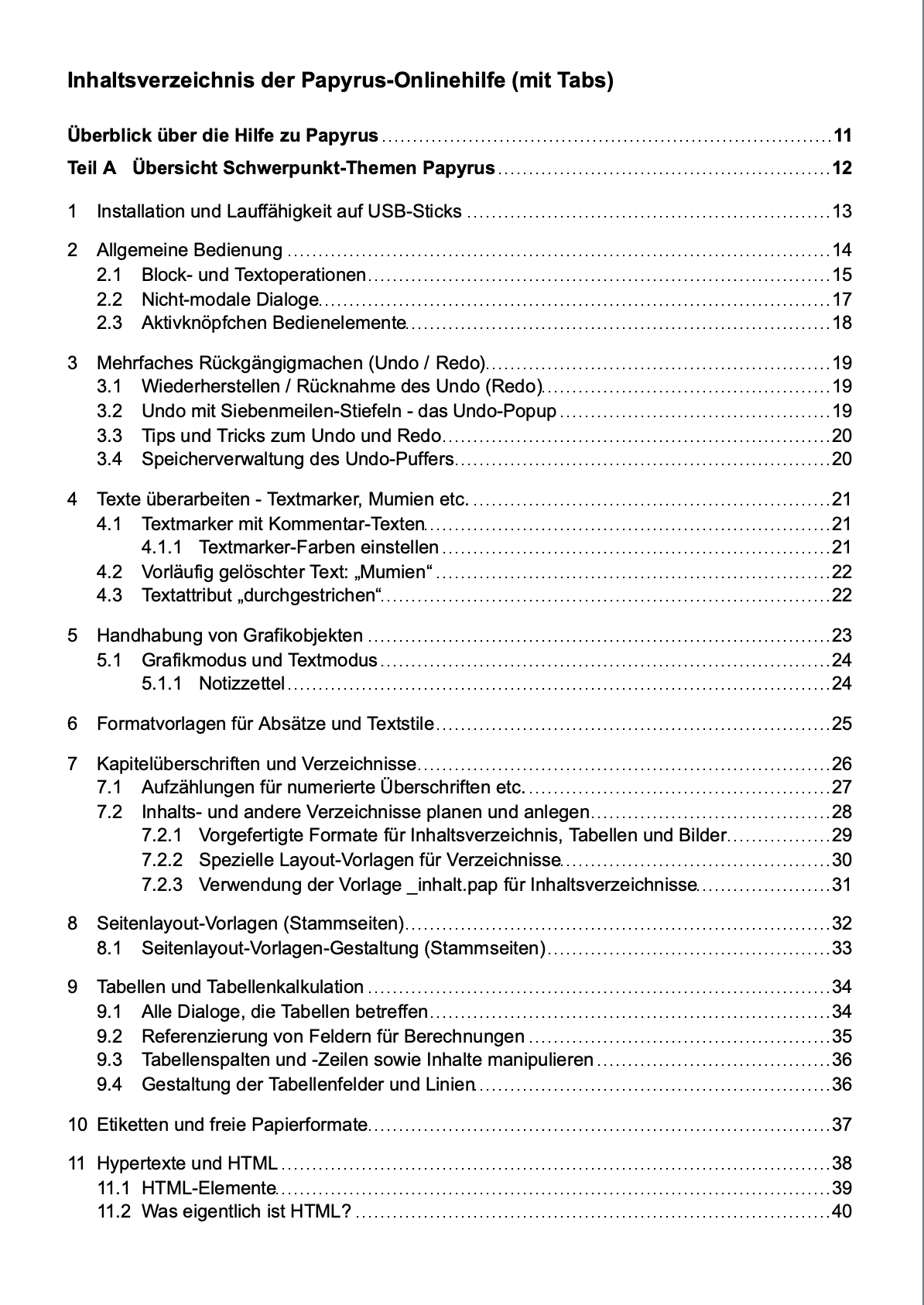 Ein IHV kann man direkt im Dokument erzeugen oder in einem neuen Dokument unter Verwendung der _inhalt.pap-Vorlage. Dabei gibt es einen wichtigen Unterschied: Für IHVs im Dokument selbst verwendet Papyrus die Querverweis-Funktion, durch die sämtliche Tabulator-Zeichen in den IHV-Einträgen durch Leerzeichen ersetzt werden. Bei einem externen IHV passiert diese Wandlung nicht und die Tabulatorzeichen stehen für Formatierungszwecke (z.B. Ausrichtung der Nummerierungen und Überschrifttexte an bestimmten Tabulatorpositionen) weiterhin bereit. Die folgenden Bilder verdeutlichen den Unterschied (Klicke auf ein Bild und danach auf den Pfeil nach rechts – bei jedem Klick wechselt das Bild und zeigt die Unterschiede).