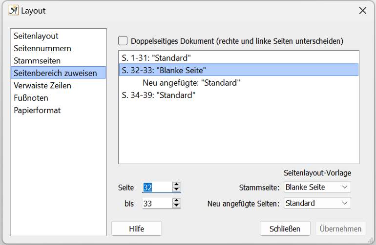 Hier z.B. habe ich eine „Blanke Seite“ definiert und 2 Seiten zugeordnet, die nicht wie der Rest aussehen sollen: