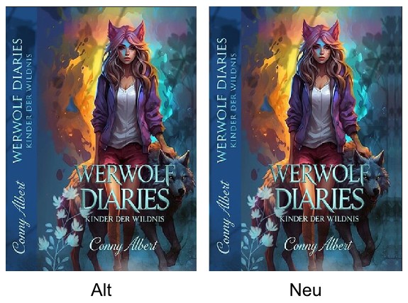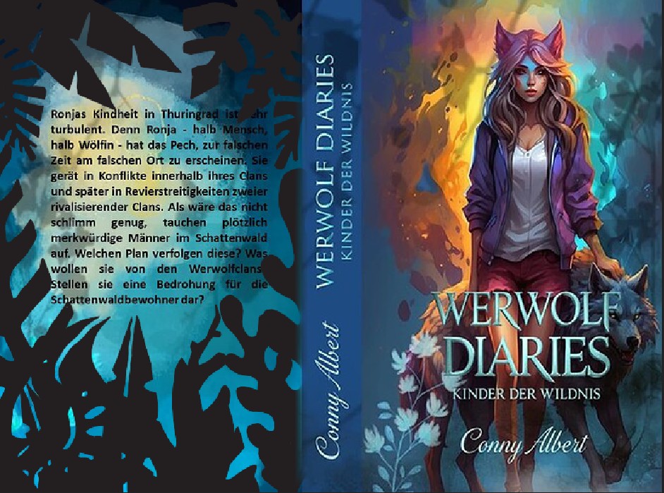Comicstil gefällt mir, Schrift passt. Wenn englisch, dann Werewolf. Name nach oben, damit unten mehr Platz ist für den Titel und Untertitel. Vorderseite wenn möglich nach links verschieben, mehr Platz neben dem Wolfskopf. Weisse Pflanze stört.