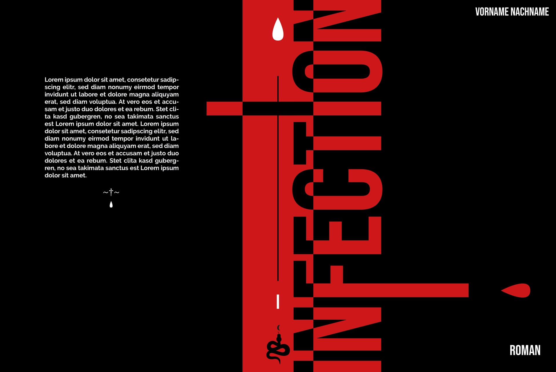 Ansonsten gefällt mir das schlichte Schwarz-Weiß mit dem Roteinschlag. Auch der Knick in den Buchstaben wird ein Eye-Catcher sein, da es um den Buchrücken herumgeht.