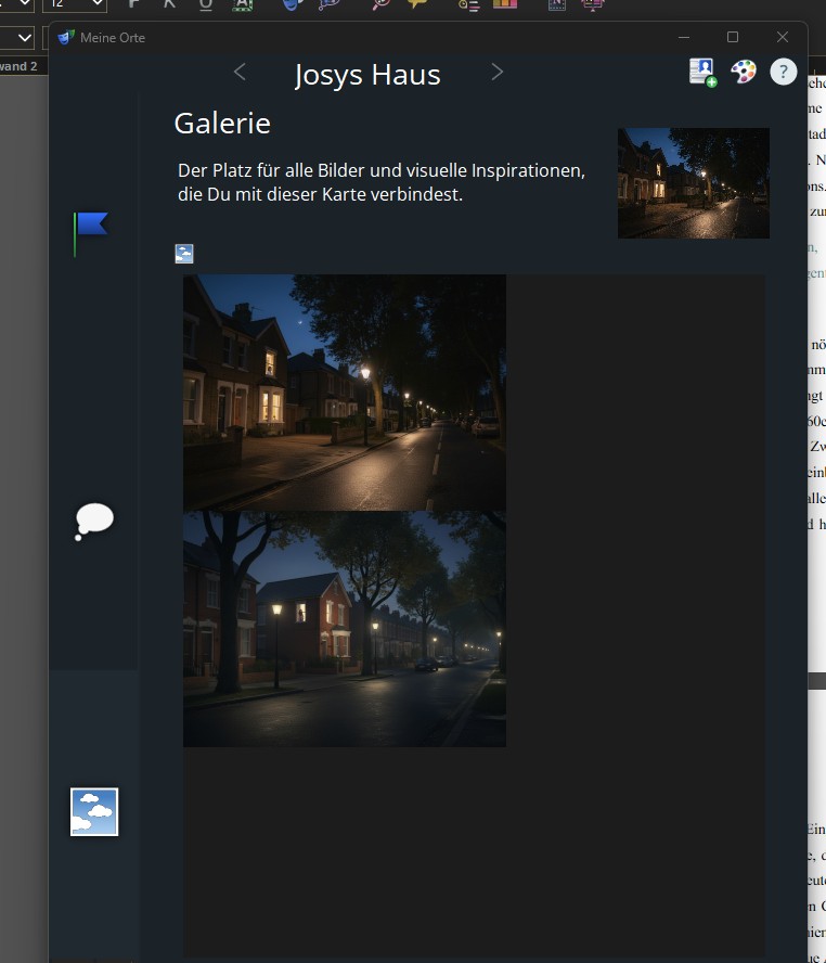 Wenn ich direkt im Text einen Ort verlinke, öffnet sich ein Fenster. Dort kann ich im letzten Reiter alle möglichen Bilder hinzufügen, die mir Inspiration für den Ort geben. Soweit so gut.