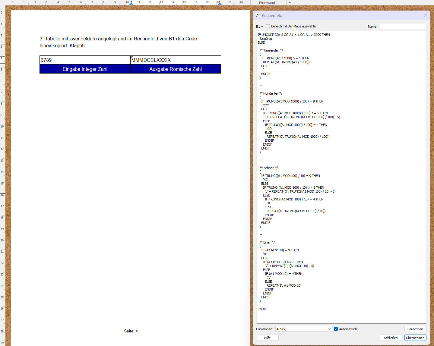 Schreibe für die Papyrus Tabellenkalkulation Code, der eine in einem Feld eingegebene Integerzahl in einem anderen Feld als Römische Zahl ausgibt. Gebe an, in welchem Feld der Code platziert werden muss. Schreibe den Code mit konsistenter Einrückung und klarer Klammerung sowie Kommentar. Alles Wissenswerte über die Papyrus Tabellenkalkulation findest du im beigelegten PDF!