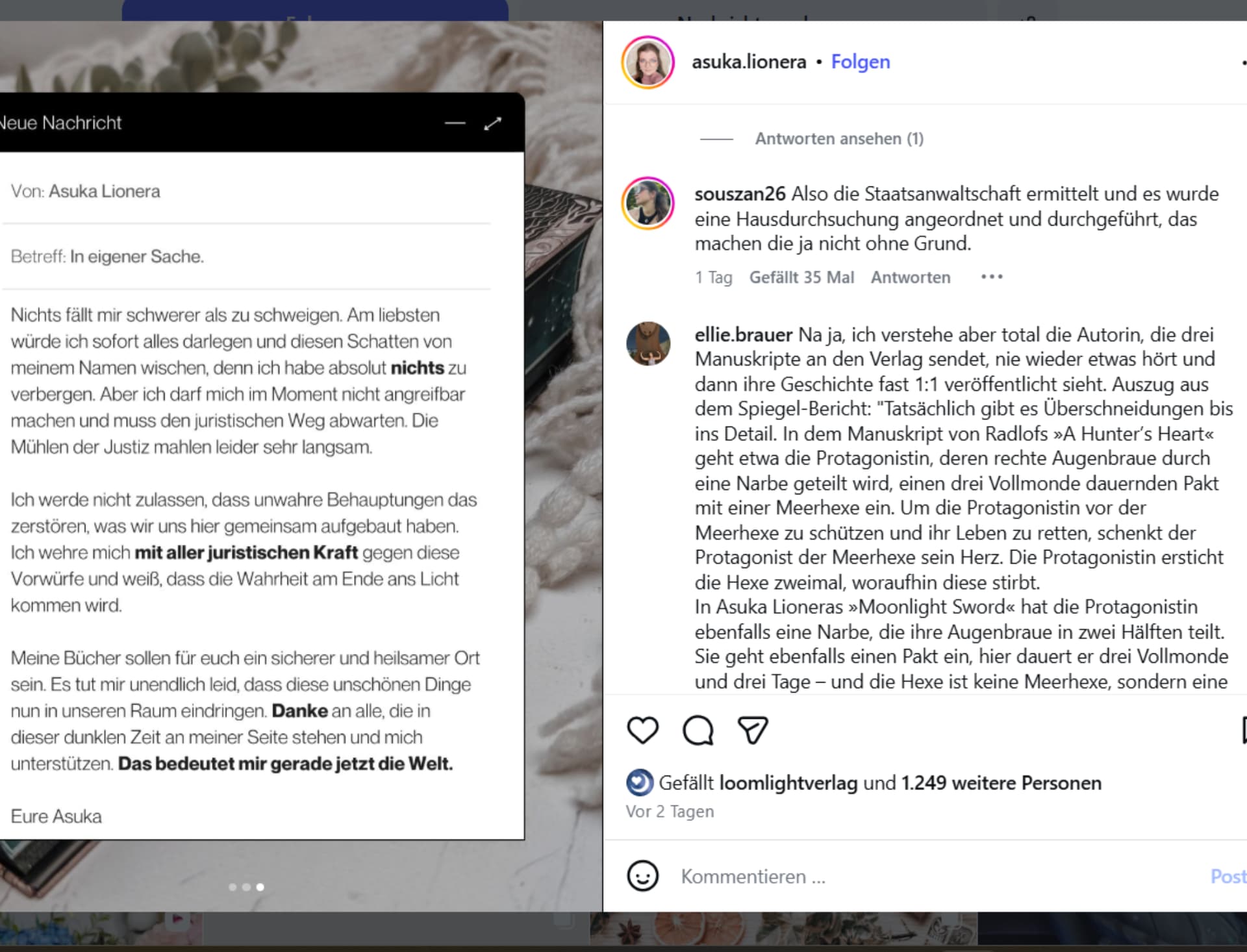 Wir betonen ausdrücklich, dass der Thienemann-Esslinger Verlag und Asuka Lionera keine fremden Werke verwendet haben und es keine Weitergabe von Inhalten aus Exposés oder Manuskripten an andere Autorinnen oder Autoren durch Verlagsmitarbeitende gegeben hat. Einzelne Vorwürfe, die uns im Rahmen der Anfrage des SPIEGEL mitgeteilt wurden, lassen sich aus unserer Sicht objektiv widerlegen. Die vermeintlichen Übereinstimmungen betreffen oft genrespezifische Topoi und Motive, die für sich genommen nach dem Urheberrecht nicht geschützt sind.