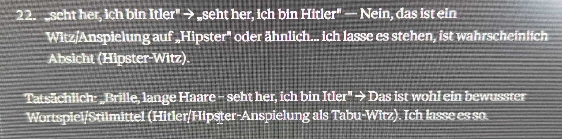 Sollten noch andere KIs verwenden, um ihr Zeugs auf Rechschreibung zu prüfen, hab ich für euch hier eine Lösung, die zwar (wie alle) nicht perfekt ist. Aber die endlich eine gewisse Leichtigkeit mitbringt.