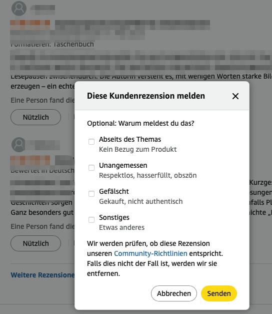 Heute habe ich extra mal mit meinen erhaltenen Rezensionen den ‚Meldetest‘ gemacht, weil ich wissen wollte, ob das leicht zu bewerkstelligen ist. Nach dem Button ‚melden‘ erscheint dieses Auswahlmenü, das ich verständlicherweise nicht weiter verfolgt habe.