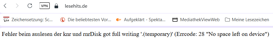 Weiß jemand, was das ist? Ich habe noch 27 GB frei auf der Platte. Wenn ich lesehits . de öffnen möchte, bekomme ich jedoch diesen Hinweis.