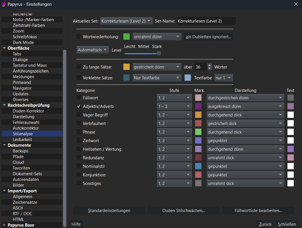 Ich nutze Papyrus 12 und habe die Stilanalyse so hoch wie möglich eingestellt. Habe ich noch einen Fehler in den Einstellungen?