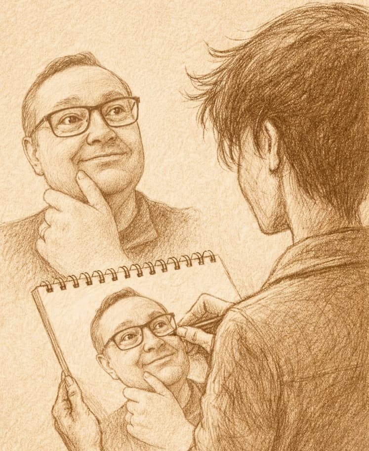 Jetzt überlege ich was für den Rücken und da hat mir eine KI vorgeschlagen, ich könne ja meine Titelfigur mit einem Bild von mir verbundeln.