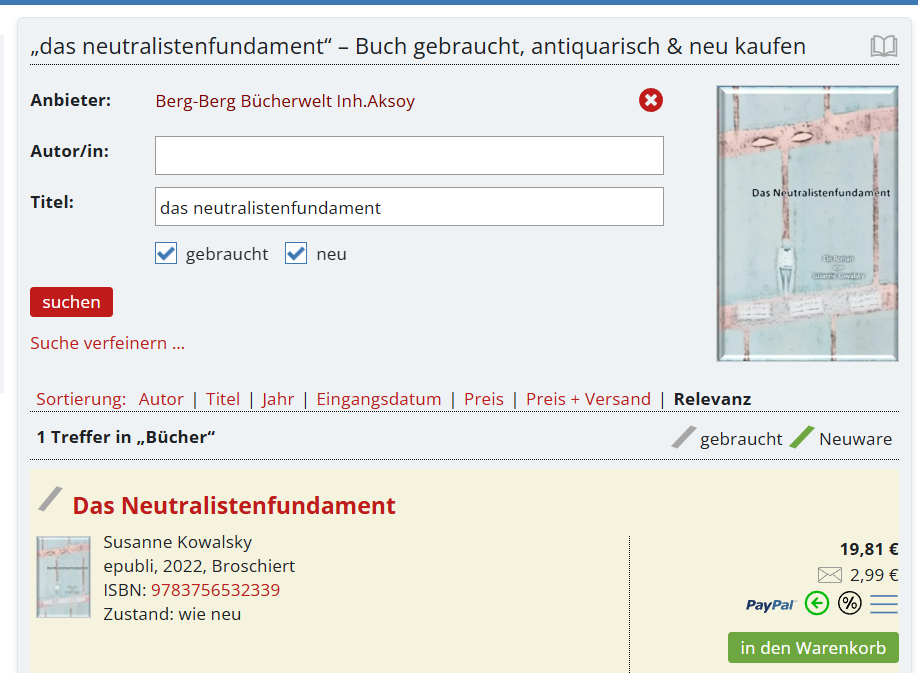 Ja, das wäre wirklich interessant. Aber wie gesagt, ich habe schon mal andere Titel von mir entdeckt. Auf anderen Plattformen. Alle Anbieter mit jeweils guten bis sehr guten Bewertungen. Seltsam. Andererseits wundere ich mich heutzutage über nichts mehr.