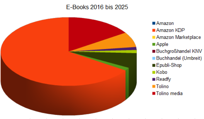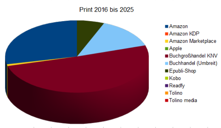 Bei mir wäre das eine eher langweilige Torte, die praktisch nur aus Amazon Verkauf und Amazon KDP besteht (monetär ca. 2/3 zu 1/3). Das bisschen BoD und Tolino würde man gar nicht erkennen. Wie kommst du denn zu deinen KNV Verkäufen?