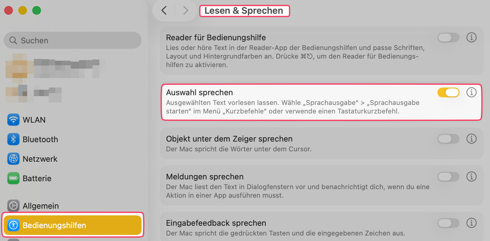 Am Mac kann man sich mit der eingebauten Funktion den Text vorlesen lassen. In der Standardeinstellung muss man dazu den Text erst markieren und dann das Kürzel Option-ESC drücken.