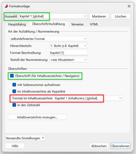 Spannend ist jetzt das Dropdown „Format im IHV: Kapitel 1 (Inhaltsverz.)“ [roter Kasten].