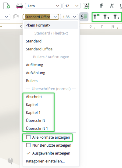 Klickst Du auf „Alle Formate anzeigen“, siehst Du noch etliche mehr (grüner Kasten) - besonders nützlich, wenn Du ein Sachbuch mit mehreren hierarchischen Ebenen schreibst: