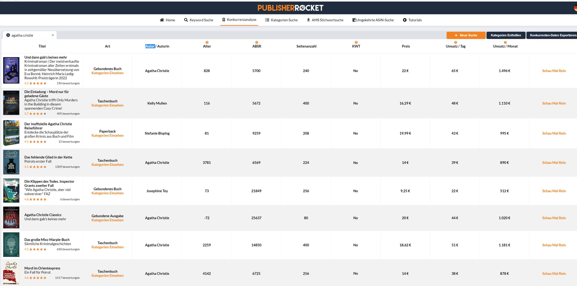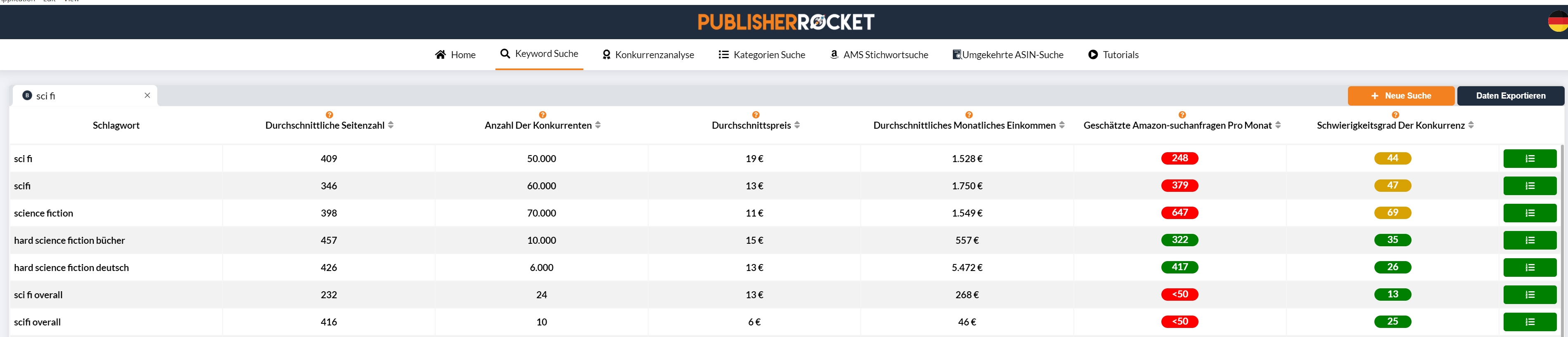 Wer sich für Stichwortsuche bei Amazon interressiert, dem empfehle ich PublisherRocket. Auch wenn der Preis sich verdoppelt hat, seit ich das Programm gekauft habe, ist es immer noch kostengünstiger als Helium 10. Helium 10 ist natürlich mächtiger, aber meiner Meinung brauchen nur KDP-Profis, die ihren Lebensuntrhalt mit T-Shirts, Tassen etc. verdienen dieses Tool.