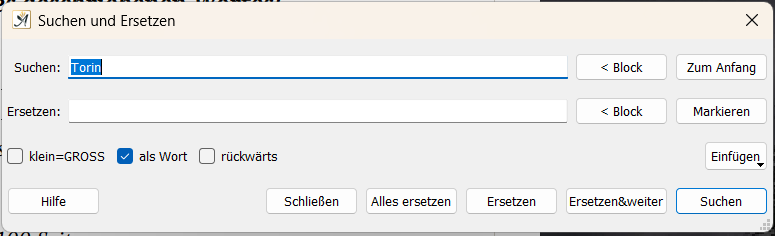 Beispiel: Ich will das gesamte Dokument nach dem Wort „Torin“ durchsuchen. Wie stelle ich das an?